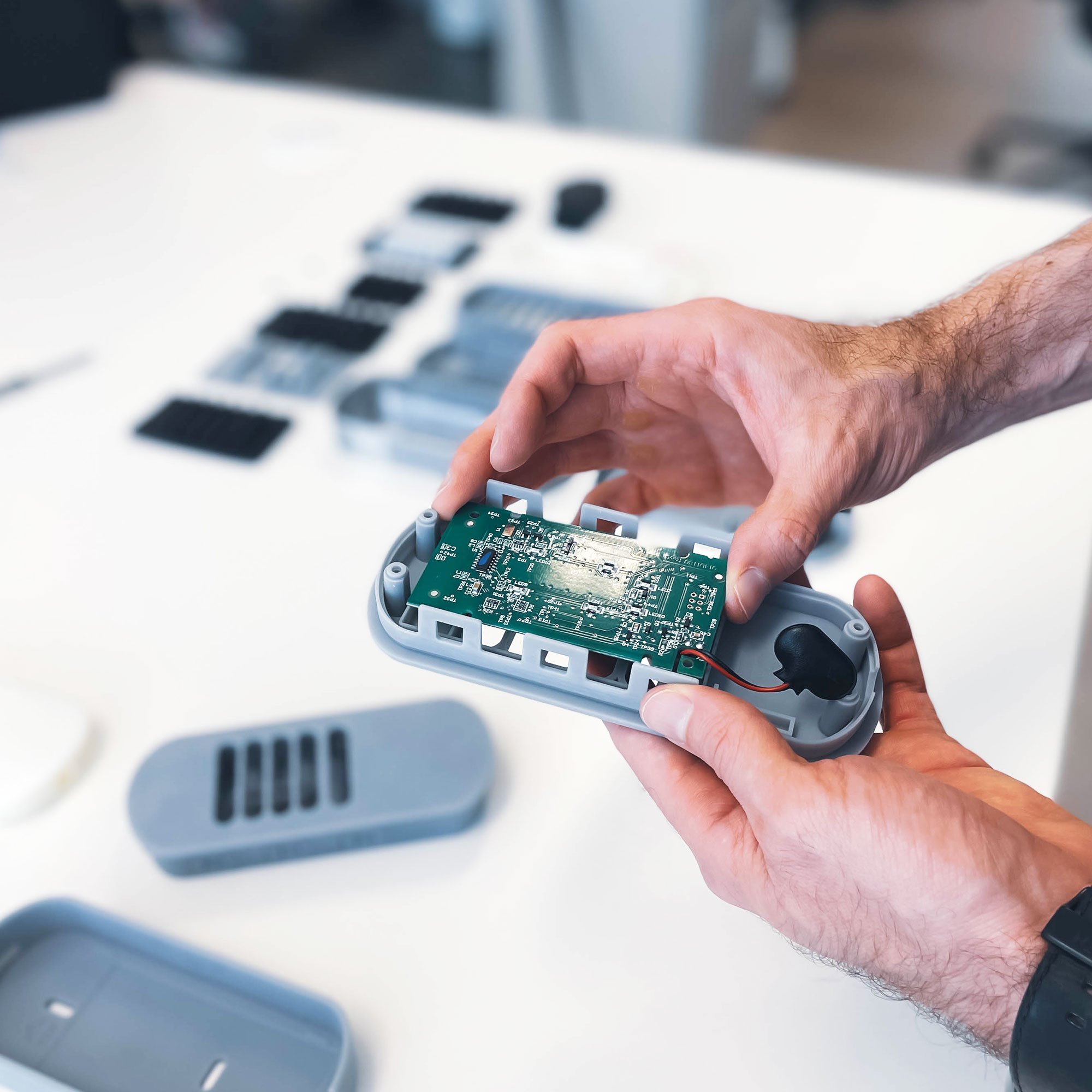 With the concept direction set, our engineers set about build Design-For-Manufacture ready 3D CAD and production drawings. Through constant collaboration with Chamberlain’s own Engineering team, our engineers built out all the physical parts, including an IP rated silicone keypad design, ready to fit the provided electronic components. Whistle supported testing of the IP rating to ensure the design was fit for purpose.